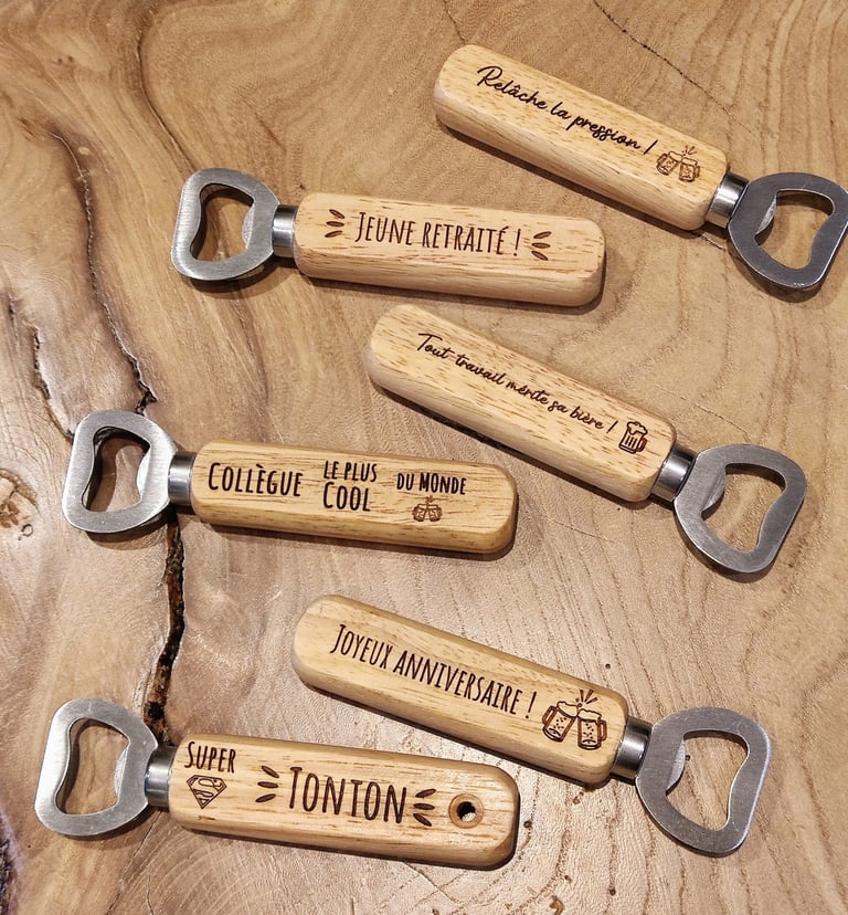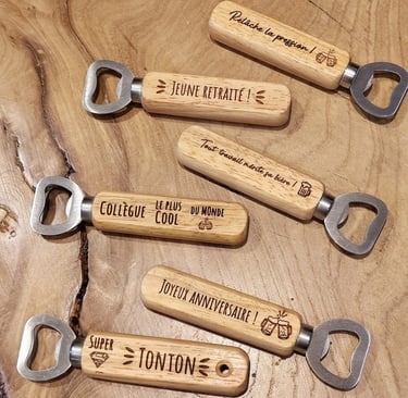 Offrez une touche d’originalité à vos moments festifs avec nos décapsuleurs personnalisés en bois gravé.