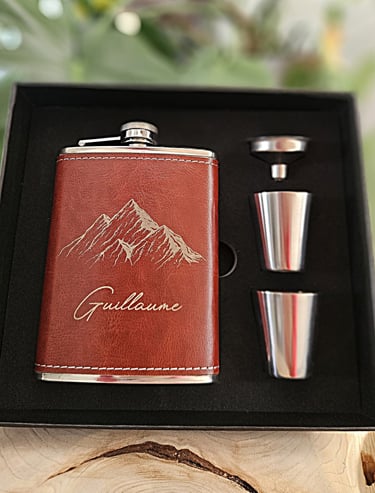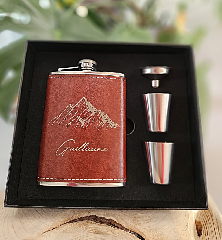 Coffret flasque avec entonnoir et gobelet, entièrement personnalisable avec un prénom ou un message gravé, pour offrir un cadeau unique, élégant et pratique.
