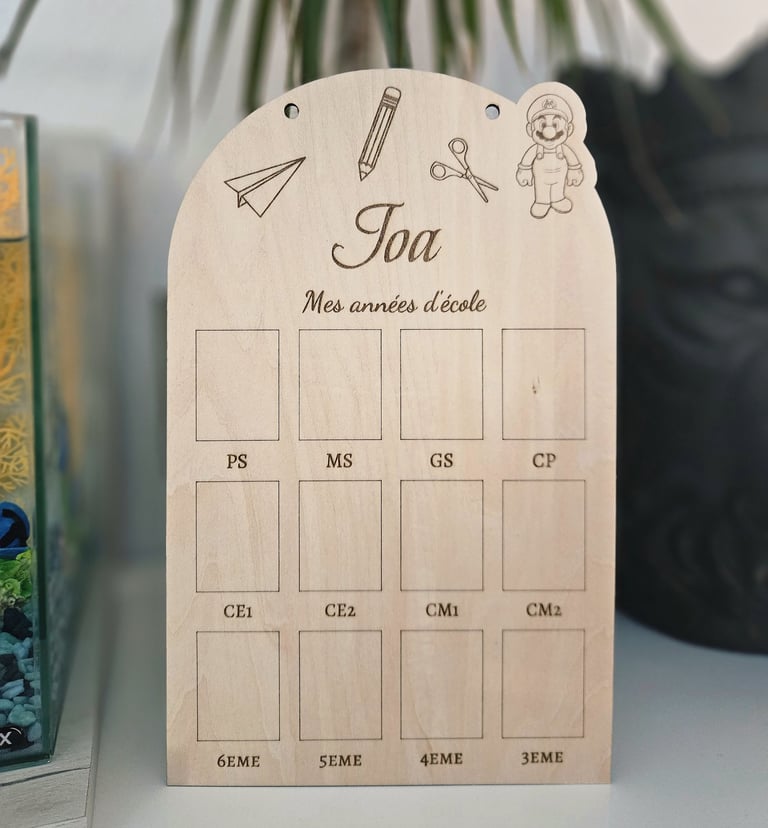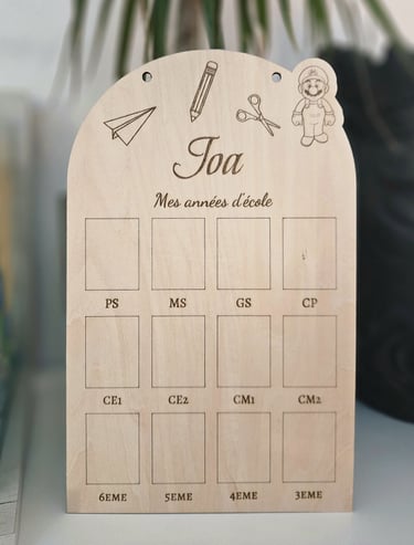 Plaque photo souvenir gravée en bois, de la petite section à la troisième. 12 emplacements pour capturer chaque année et garder un souvenir unique !