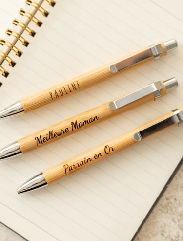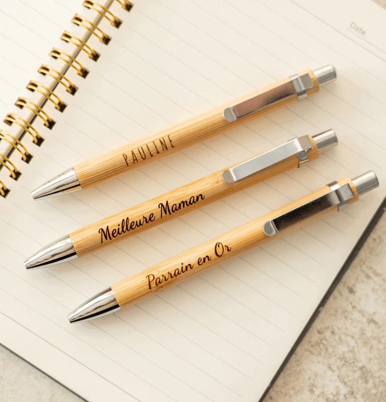 Stylo en bambou personnalisable, gravé avec un texte, un prénom, un message ou un logo, il s’adapte aussi bien aux besoins des particuliers qu’à ceux des professionnels.