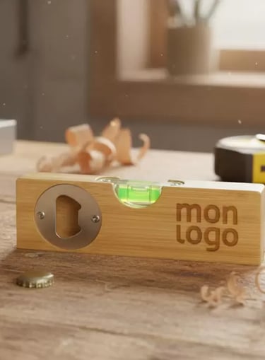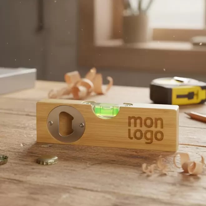 Objet pratique et original, ce duo niveau à bulle et ouvre-bouteille en bambou allie utilité et design naturel. Personnalisable, il constitue un cadeau unique pour particuliers, entreprises et professionnels, idéal pour toutes les occasions.