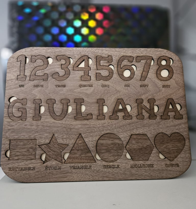 Découvrez notre puzzle artisanal en bois, entièrement personnalisé avec le prénom de votre enfant.